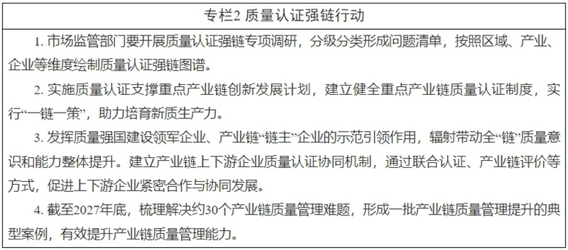 《方案》围绕增强小微企业质量竞争力、提升区域产业质量竞争水平、优化认证服务供给等方面提出了11项重点任务,设置了“质量认证‘精准帮扶’行动”“质量认证强链行动”等4个工作专栏。