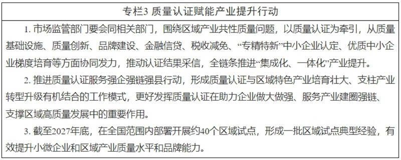 《方案》要求,市场监管部门要会同相关部门,围绕区域产业共性质量问题,以质量认证为牵引,从质量基础设施、质量创新、品牌建设、金融信贷、税收减免、“专精特新”中小企业认定、优质中小企业梯度培育等方面协同发力,推动认证结果采信,全链条推进“集成化、一体化”产业提升。