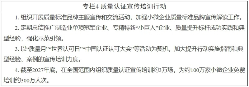 11. 强化质量意识。鼓励行业组织、认证机构和质量专家,面向小微企业更高管理者开展质量管理公益培训,提供重点管理体系标准贯标服务,引导小微企业增强运用质量管理体系促进企业高质量发展的内驱力。发挥“小微企业质量认证提升行动服务平台”和“百万家企业全面质量管理培训平台”作用,采取线上线下相结合的方式,为小微企业提供质量管理专业培训辅导。